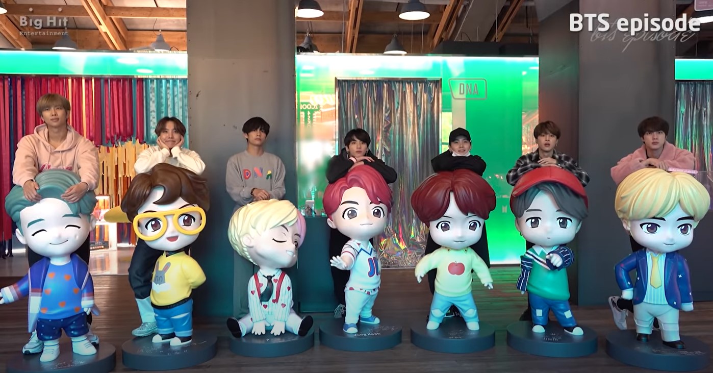 각자의 케릭터 인형들 앞에 서 있는 방탄이들